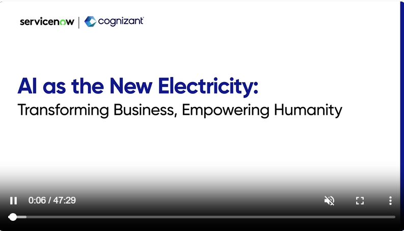 Reimagining Business in the Age of AI Join industry experts Elisha Harrington from ServiceNow& Innovation Office and Prabjoth Saimbhi, Global Head of Alliances, Innovation &Â Practices at Cognizant, for an insightful fireside chat exploring the transformative power of artificial intelligence