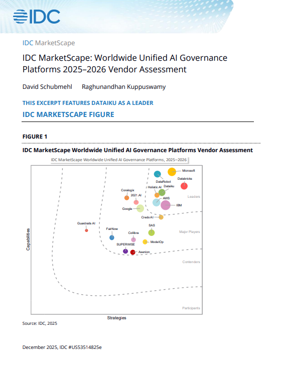 “By integrating governance directly into AI workflows, Dataiku supports enterprise-scale AI through: Embedded controls across the AI lifecycle Open, model-agnostic architecture Continuous oversight without operational drag In this exclusive excerpt, learn how IDC MarketScape assesses AI governance platforms, and what CIOs and data leaders should prioritize when governing analytics, ML, GenAI, and AI agents at scale. “